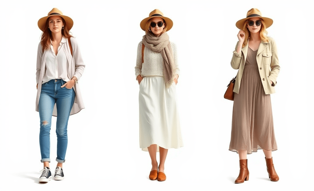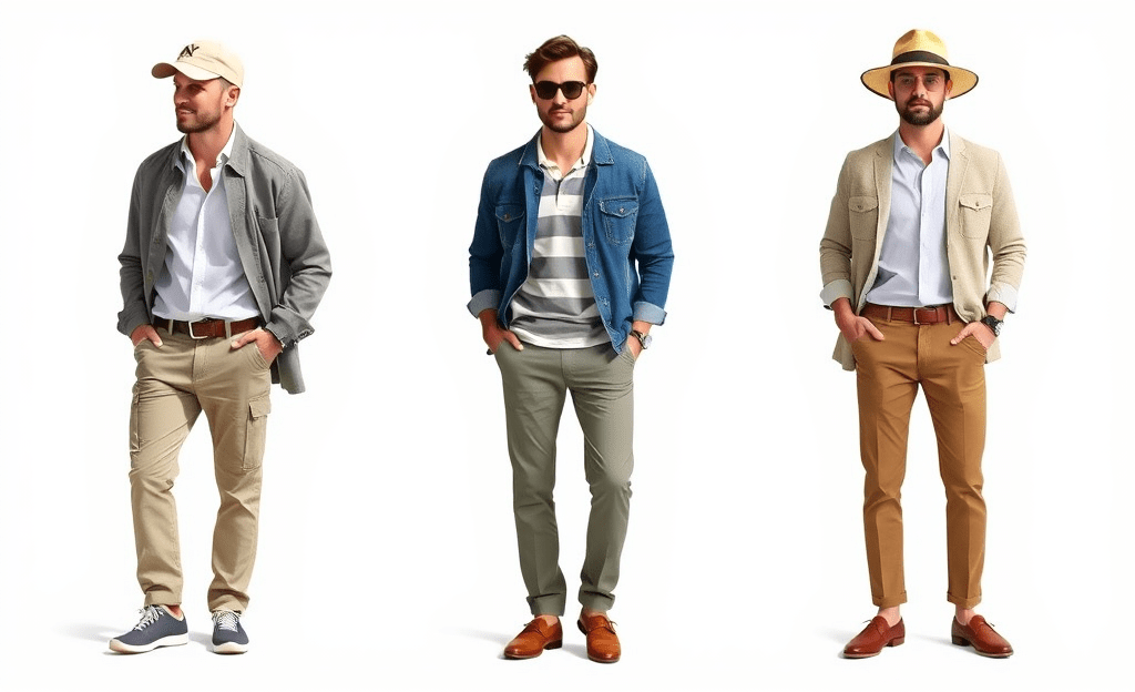 *Button-up shirt layered with a light cardigan, khaki pants, loafers, and a straw hat suitable for variable weather.