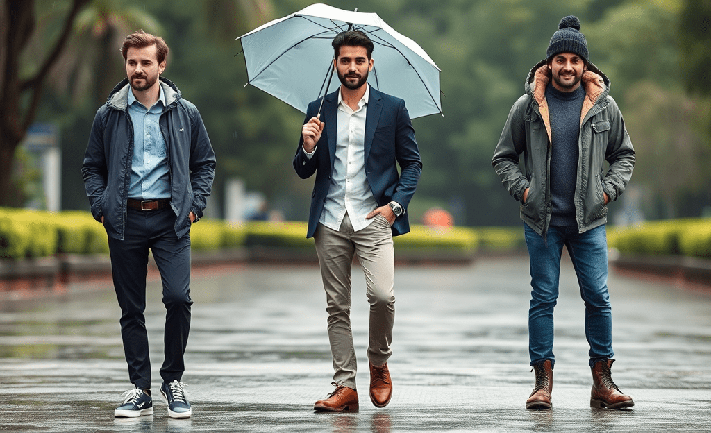 <오늘의 추천 코디(남자)> *Light waterproof jacket, breathable long-sleeve shirt, quick-dry pants, waterproof sneakers, compact umbrella