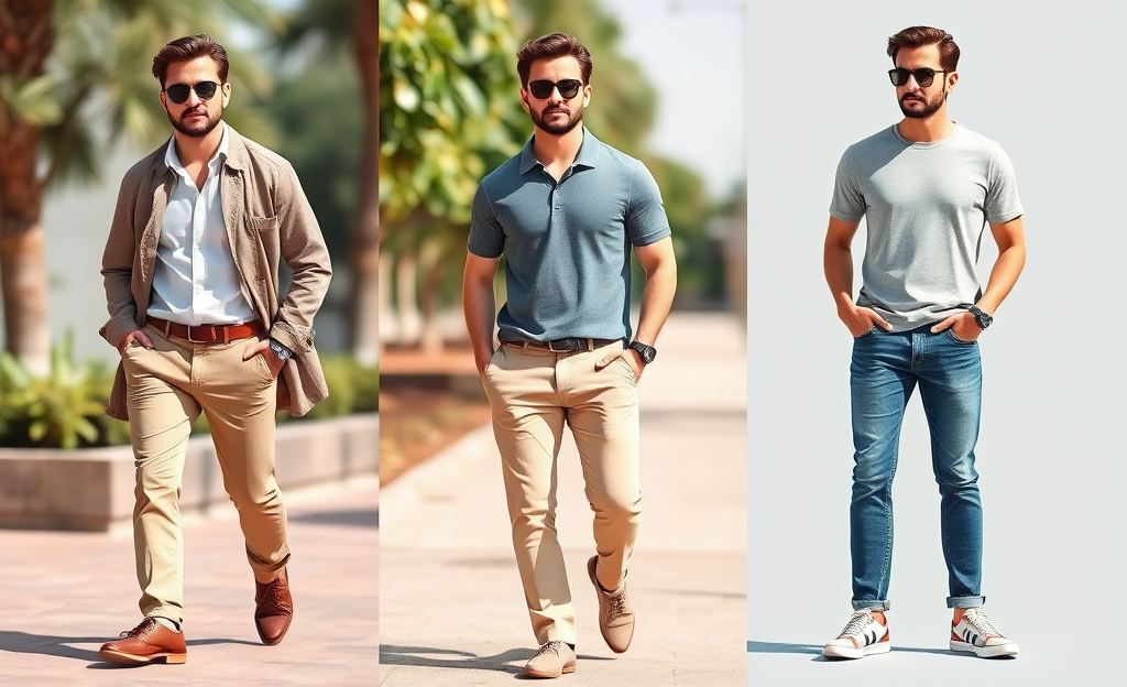 *Casual polo shirt paired with beige trousers and sunglasses for a sunny day.