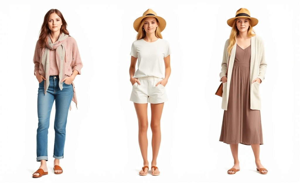 *Simple T-shirt with high-waisted shorts and a sun hat for outdoor activities.