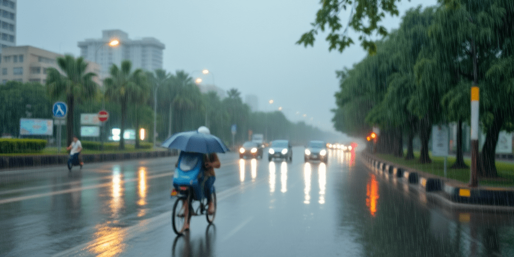 "오늘은 중간 정도의 비가 내리며, 습도도 높아 우산과 방수 옷이 필요합니다. 바람은 초속 3m로 약간 불며, 기압은 1012 hPa로 안정적입니다. 아침 일출은 6:24, 저녁 일몰은 18:20로 하루가 짧아졌어요. 날씨에 맞는 적절한 옷차림으로 우기를 대비하세요."