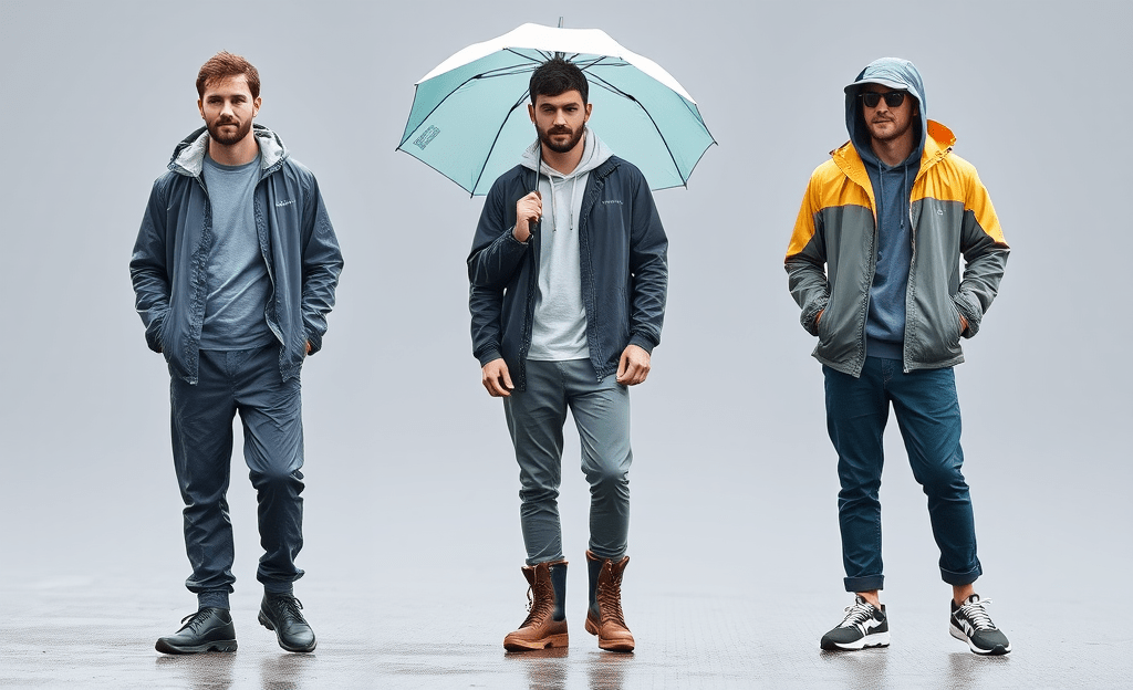 *Layered outfit with a raincoat, thermal shirt, waterproof boots, and a compact umbrella
