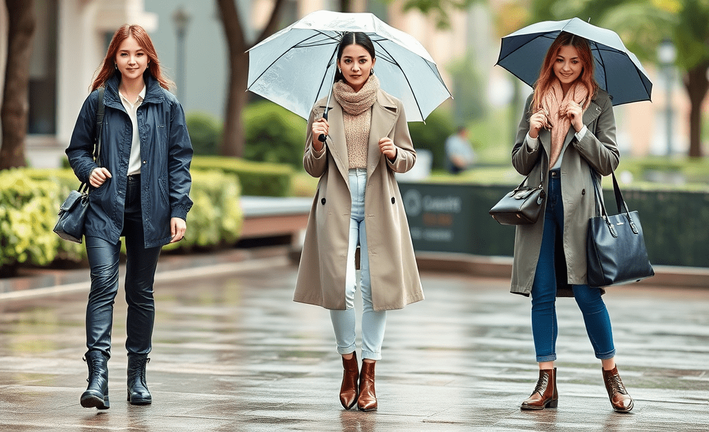 *Stylish raincoat, layered top, waterproof footwear, tote bag, umbrella