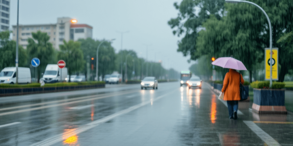 "비 오는 날에는 방수 재킷이나 우산이 필수입니다. 가벼운 긴팔 블라우스와 방수 스키니 또는 레인 부츠로 코디하면 세련되면서도 실용적입니다. 머리에는 방수 모자나 우비를 착용해 습기를 막는 것도 좋습니다."
