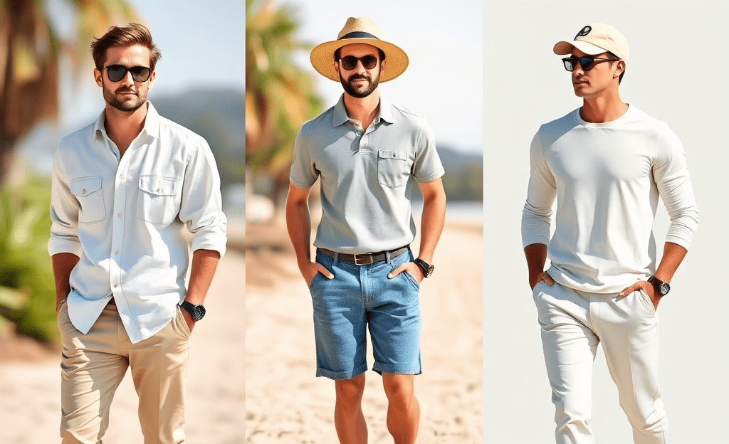 *Short-sleeve polo shirt paired with denim shorts and a sun hat for a relaxed vibe.