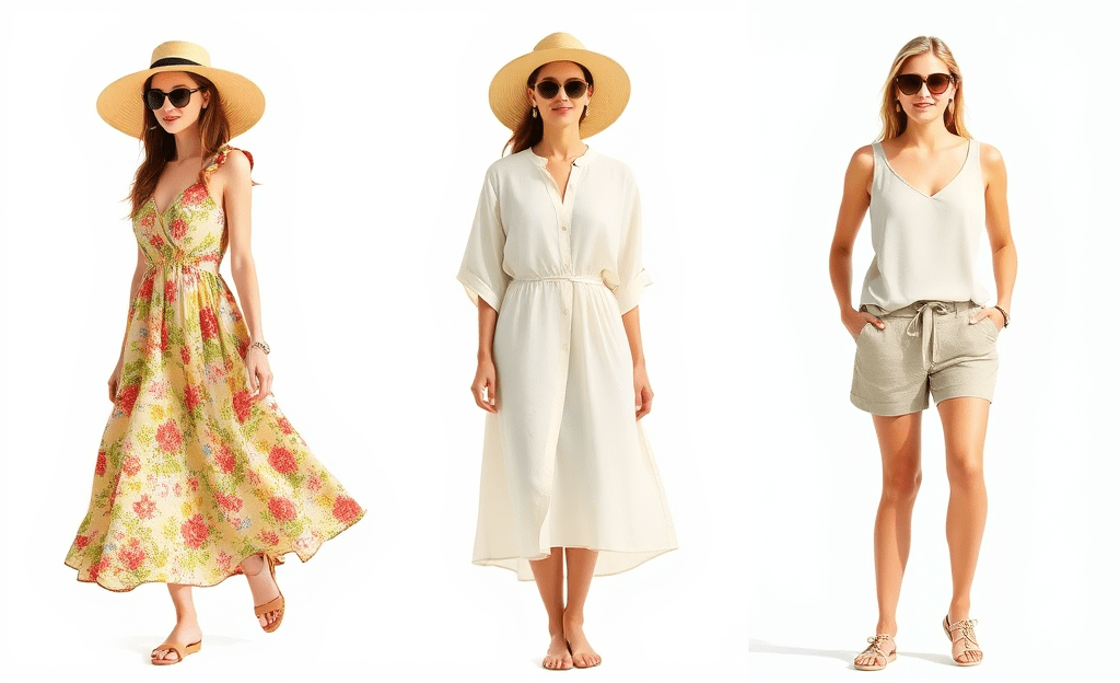 *Flowy summer dress with wide-brim hat and sunglasses for sunny days.