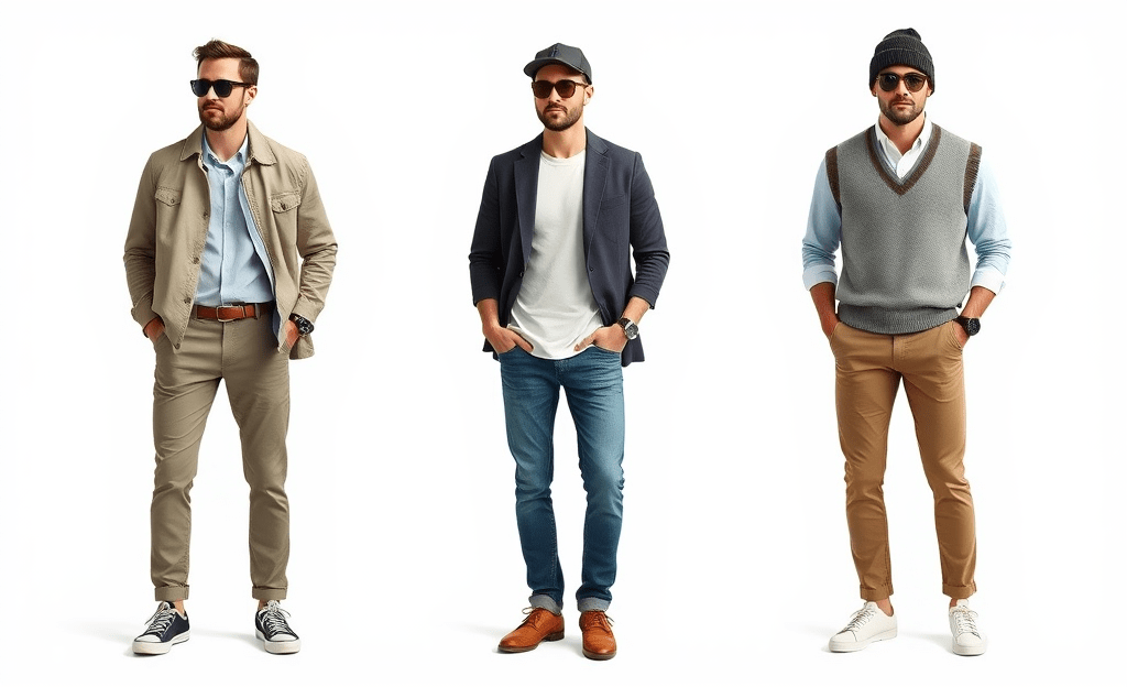 *Sweater vest, collared shirt, khakis, sneakers, sunglasses, beanie