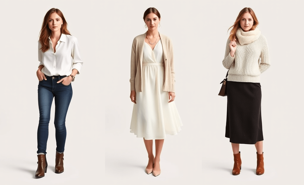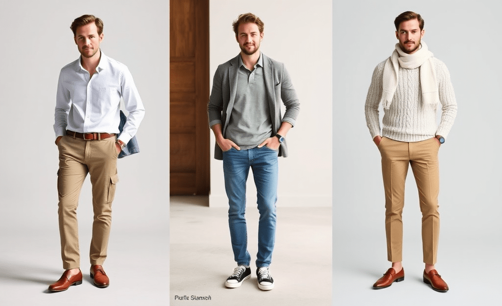 *Soft knit sweater with beige trousers, loafers, and a light scarf for a refined appearance.