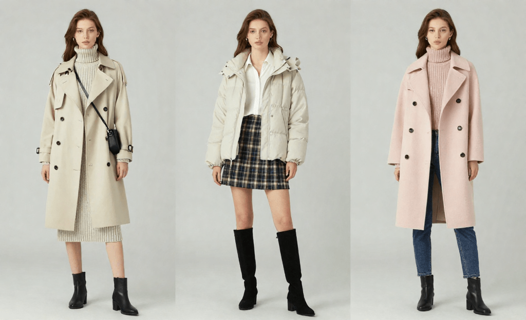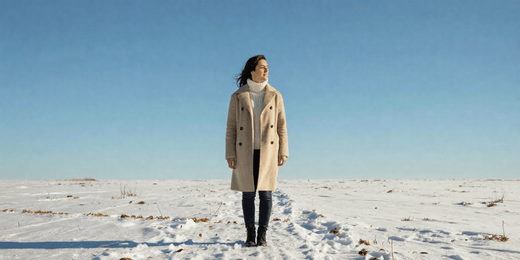 *Soft pastel-colored wool coat, turtleneck, slim jeans, ankle boots