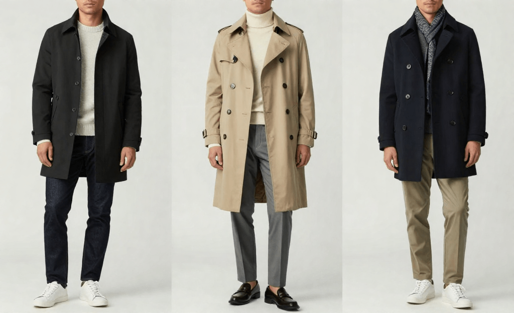 *Slim-fit black coat, neutral-toned knit sweater, dark jeans, white sneakers