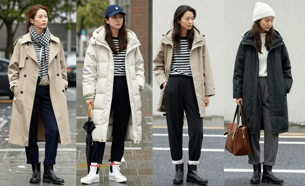 "이날은 긴팔 블라우스 또는 니트와 함께 방수 트렌치코트 또는 가벼운 패딩을 걸치는 것이 좋습니다. 얇은 목도리나 모자, 방수 신발로 포인트를 주면 더욱 세련된 스타일을 연출할 수 있어요. 스커트보다는 팬츠를 선택해 활동성을 높이고, 우산이나 방수 가방으로 비에 대비하세요."